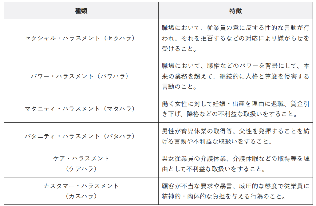 職場におけるハラスメントの種類には、セクシャルハラスメント(セクハラ)、パワーハラスメント(パワハラ)を中心に、マタニティ・ハラスメント(マタハラ)や、パタ二ティ・ハラスメント(パタハラ)、カスタマー・ハラスメント(カスハラ)、ケア・ハラスメント(ケアハラ)、カスタマー・ハラスメント(カスハラ)など、時代と共に増加傾向にあります。