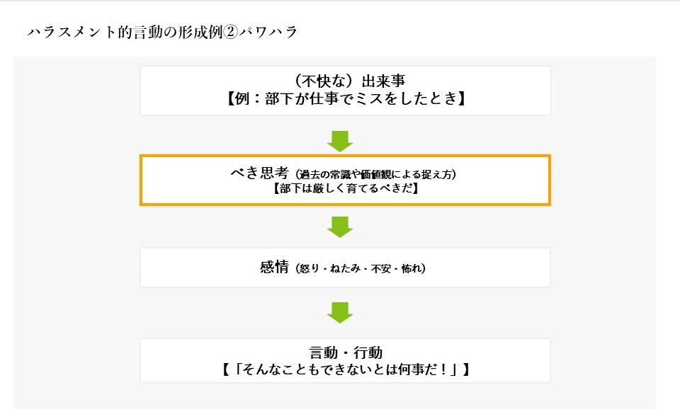 実は、「部下が仕事でミスをした」出来事に遭遇したときに、「部下は厳しく育てるべきだ」という、「べき思考」が影響して、怒りの感情がわき、結果として男性部下に「そんなことも出来ないとは何事だ!」という言動が引き起こされます。